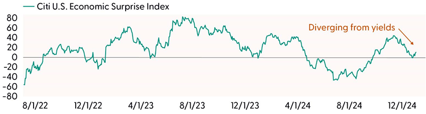 For the stock market, rates may have broken above the pressure point for risk appetite. Equity investors tolerated rising rates throughout most of last fall as the absolute level of yields was a bit more digestible and accompanied by better-than-expected economic activity. The “Yields Are Retesting an Important Resistance Level” chart highlights how 10-year Treasury yields and the Citi U.S. Economic Surprise Index rose in lockstep until mid November. (For context, the surprise index tracks how economic data compares to market expectations, with positive values indicating better-than-estimated results and vice versa for negative readings.) However, this relationship has since changed as yields continue to advance as the surprise index turns lower. The recent deviation can largely be explained by the rise in the Treasury term premium — the expected excess yield investors require for holding longer-duration Treasuries. As LPL’s Chief Fixed Income Strategist Lawrence Gillum recently noted (and explains in the January 8, 2025 Street View video), the rising term premium is mainly attributable to concerns over inflation and the massive amount of Treasury supply needed to finance our ballooning U.S. deficit.